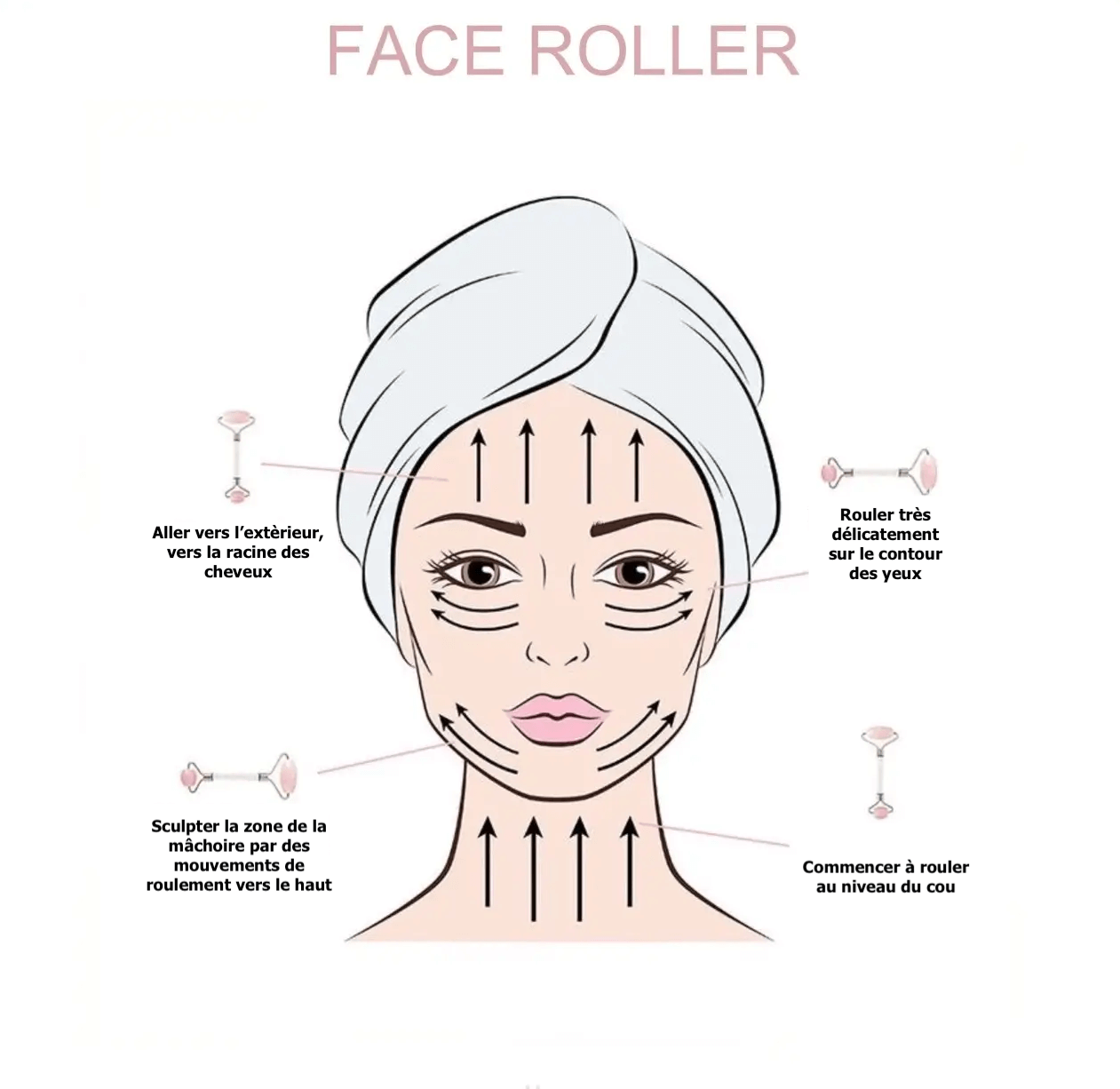 • Le rouleau large est parfait pour lisser et rafraîchir les joues, le front, le menton et le cou,