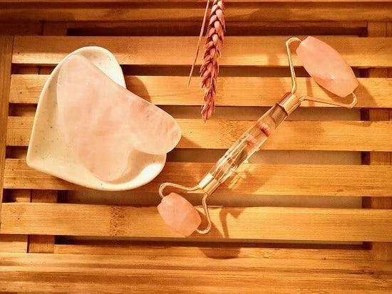 Ce coffret Gua Sha & Roller en quartz rose stimule la circulation et le drainage lymphatique pour atténuer cernes et poches,
