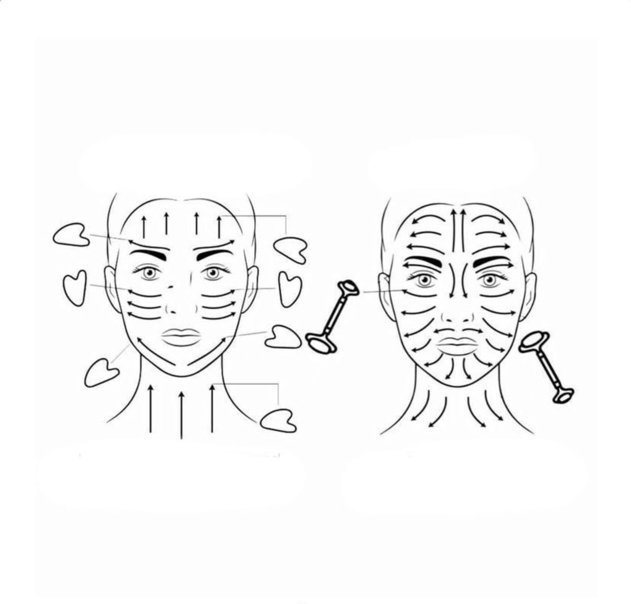 Avant toute chose, n’oubliez jamais de positionner votre Gua Sha à environ 45° par rapport à la peau. Il est essentiel de ne jamais appuyer fortement : une pression légère à modérée suffit pour stimuler la circulation sans agresser les tissus. Les mouvements doivent toujours être effectués du bas vers le haut, en suivant les lignes naturelles du visage.